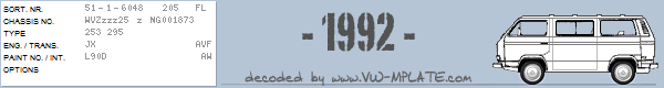 Chassis number WVZzzz25 z NG001873